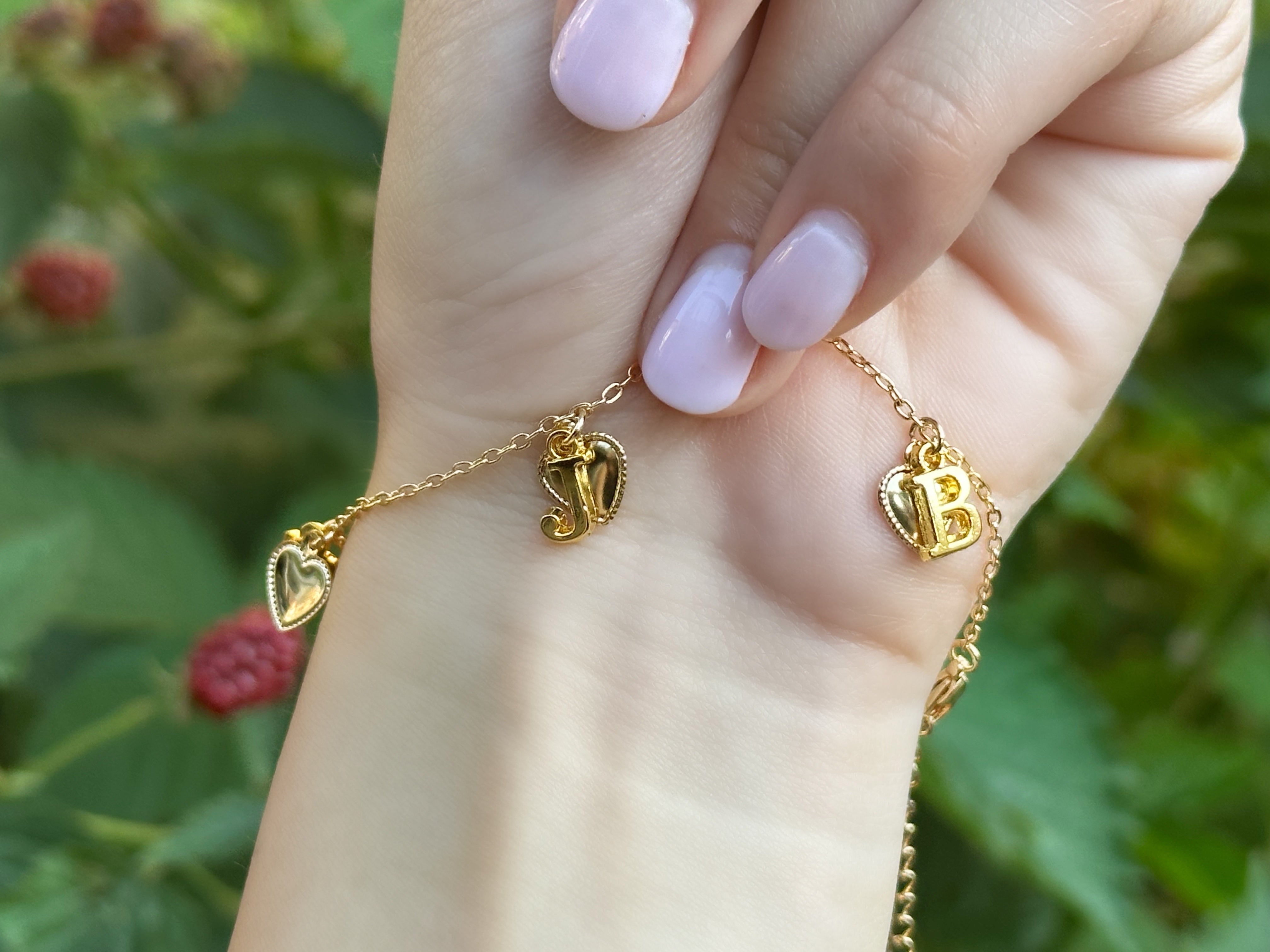This Bracelet includes beautiful gold platted Initial charms, against cute gold heart charms.